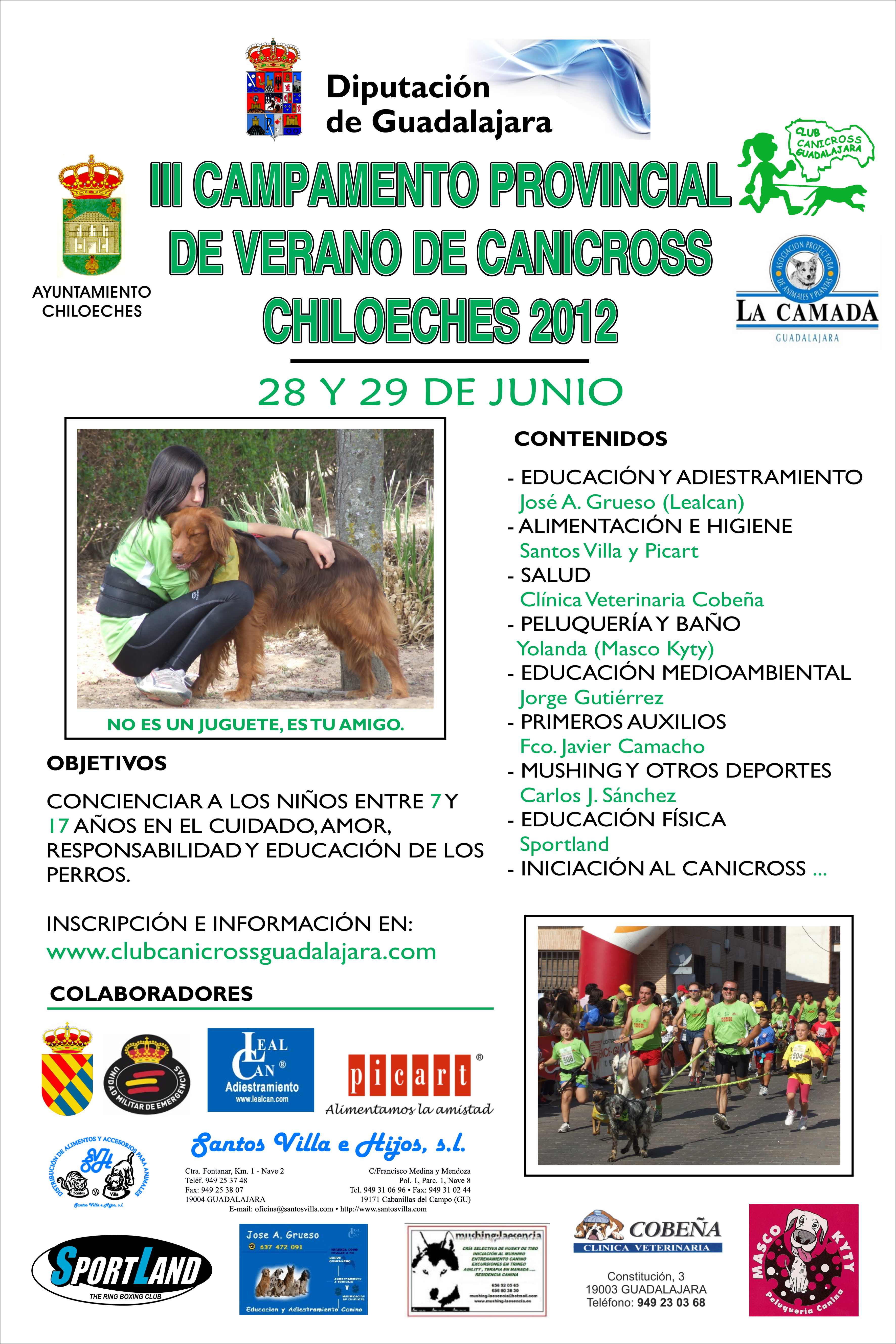 En este año 2012, los diferentes campamentos serán realizados en cuatro localidades de la provincia de Guadalajara, que serán Chiloeches, Yebes-Valdeluz, Trillo y Guadalajara, donde los niños de entre 7 y 17 años aprenderán un poco más a entender, conocer y respetar a los perros pues recibiran formacioó sobre educación, adiestramiento, peluquería, cuidados veterinarios, primeros auxilios, educación ambiental.... y por supuesto iniciación a la práctica del canicross.