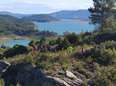 El segundo relevo es el mío, salimos del pueblo, se sale por una senda con tendencia bajada de unos dos kilómetros entre un bonito bosque que de vez en cuando en lugar de setas, cría fotógrafos de la organización, distraen mi deleite y disfrute por la carrera preguntándome como habían llegado hasta allí. Después de cruzar una carretera vigilada por protección civil continuamos por otra senda y caminos rodeados de cereal y casi sin darnos cuenta, llegamos a Valderrebollo, municipio con otra veintena de habitantes, que creo estaban casi todos allí esperándonos en el avituallamiento, vamos a muy buen ritmo y paramos poco tempo, tenemos ganas de llegar a Masegosa, Gaspar nos había chivado que allí habría almuerzo consistente, antes de llegar, se ve una chopera junto al Tajuña, varios vehículos y media docena de personas alrededor de una mesa, voy a la cabeza del grupo y al pasar junto a ellos, son pescadores, todos uniformados con traje de camuflaje, la mesa está repleta de viandas y vino, que buena pesca estáis teniendo, nos apuntamos, nos animan y aplauden, cruzamos el Tajuña y entramos en Masegosa, al subir a la plaza, observo que los compañeros están más pendientes del almuerzo que de nuestra llegada, no tienen manos para aplaudir, en una la cerveza y en otra el bocadillo de jamón, queso, lomo, y otras cosas. Pero vamos, que a ninguno nos importa, tardamos poco y menos en apuntarnos al convite, pero con ración doble, que la sesión de la mañana está hecha.