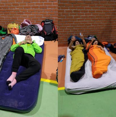Después toca instalarnos en el polideportvo, Paco me facilita el hinchado de mi colchoneta de matrimonio, junto a la cual se instala Juanvi desplegando una minúscula alfombrita que le hago recoger y al que invito a compartir cama conmigo, eso sí, cada uno en su saco.