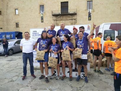 Después de un rato, nadie se mueve, seguimos felices, llega el momento de celebrar, entrega de medallas por equipos, todos somos campeones, todos los equipos hemos completado el reto, agradecimientos a autoridades y patrocinadores, Ana, la presidenta del club organizador, visiblemente emocionada es la maestra de ceremonias. El alcalde local Ignacio Ranera parece feliz y encantado por acoger el final de este primer reto y nos espera el próximo año. Por parte de la Diputación, está el diputado y alcalde de Yebra Juan Pedro Sánchez, en su intervención también valora como éxito la iniciativa del reto del viaje a la Alcarria y el compromiso de Diputación de apoyar estas actividades. Teniendo en cuenta que el próximo domingo son las elecciones municipales, ya veremos si repiten. Ana va llamando a los equipos para subir al pódium como campeones, los dos del club canicros lo hacemos juntos.