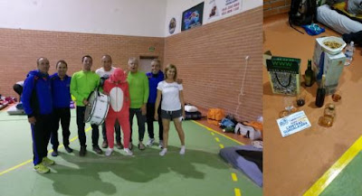 La cena es en la hospedería Princesa Elima, entre lo poco que comí, el relax del primer objetivo cubierto y lo tarde que es, tengo bastante hambre. El restaurante es acogedor y la cena buena, Paco me asombra de lo que come con la mitad de cuerpo que yo, repite ensalada campera, carne estofada y se come su postre y la mitad del de Pilu. De vuelta al polideportvo, hay que ir pensando en dormir, pero antes, Nacho y Juanvi empiezan a estar en su salsa, sacan un par de copas y dos botellas de pacharán, una muy buena y la otra huele y sabe raro, los que la prueban arrugan la cara y dicen que puede que lleve naranja, yo doy cuenta a una copita del bueno, por nuestra zona se van acercando compañeros, ofrezco la copa a Vitín, ¿Qué es?, pregunta, tu bebe que esto es bueno y natural, de un trago acaba con la copa, hace un gesto de aprobación y sigue su camino. Me tumbo a intentar dormir, es ya la una y los dos fantásticos deciden enredar por el polideportivo con las copas y el pacharán.